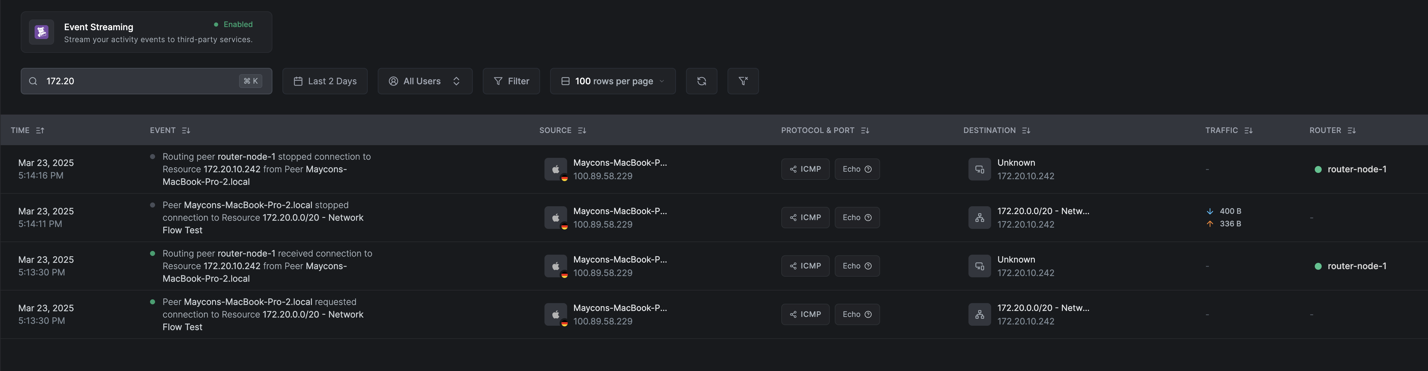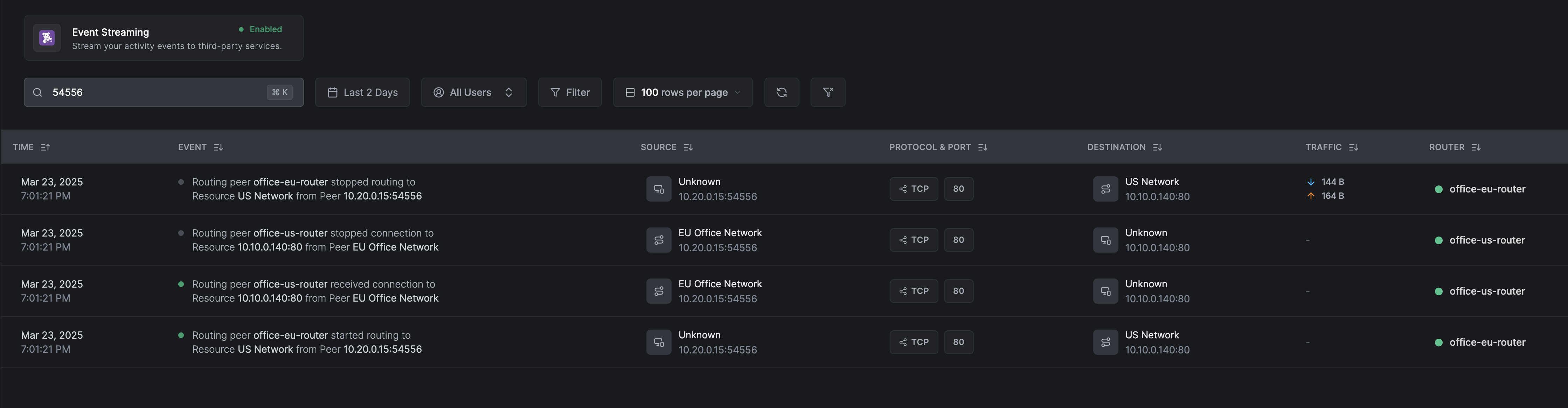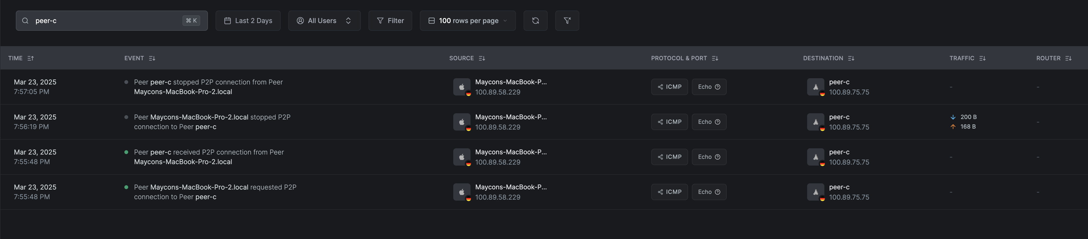 The traffic events logging functionality enables comprehensive monitoring and analysis of connections across your infrastructure. It captures network activity, including peer-to-peer, site-to-site, peer-to-resource, and other network traffic events.