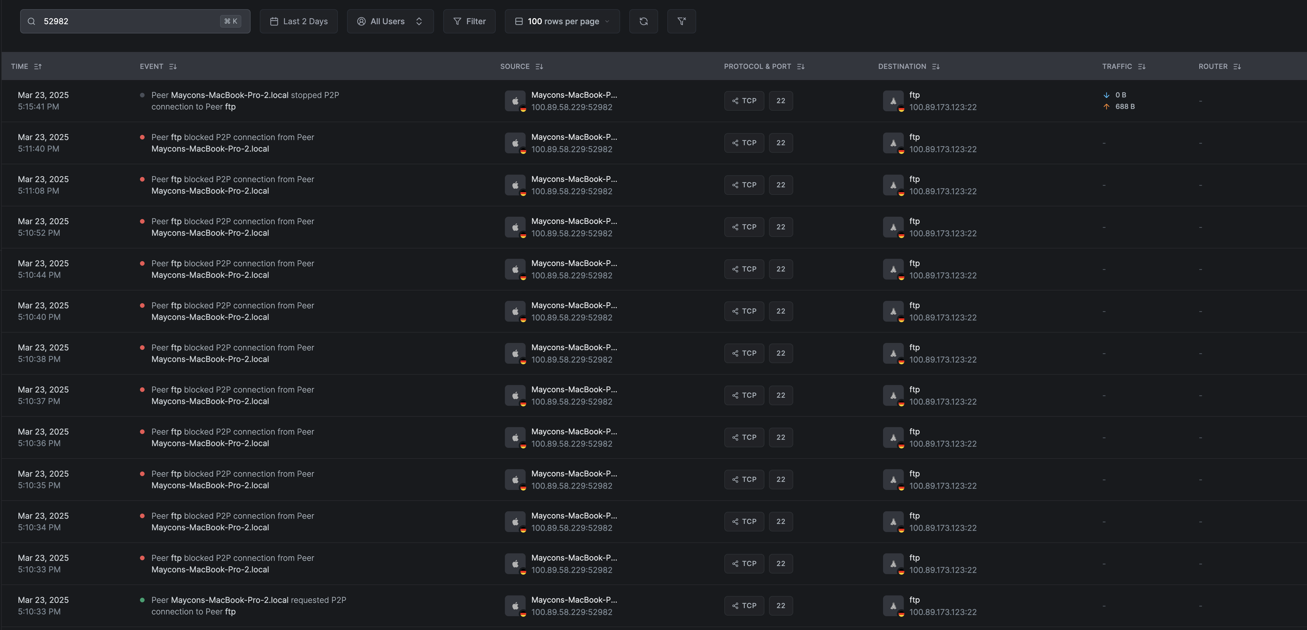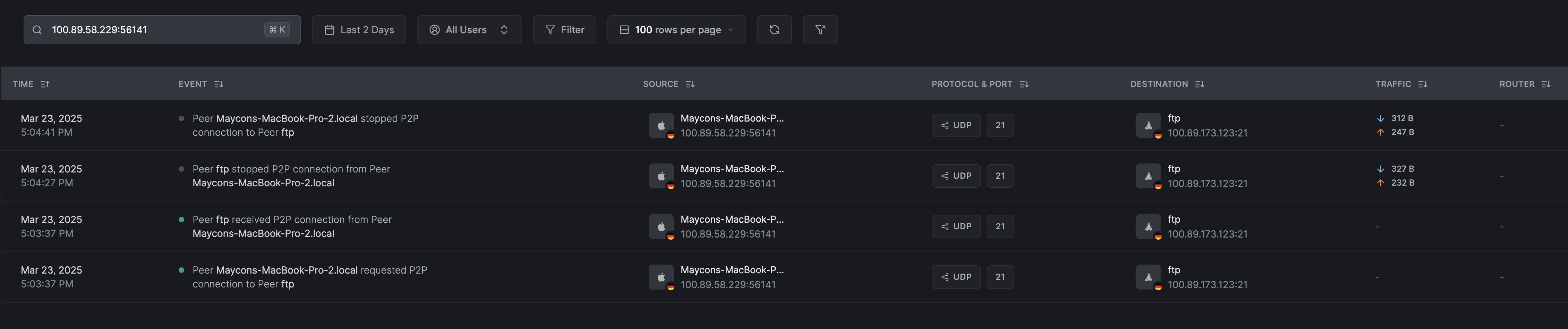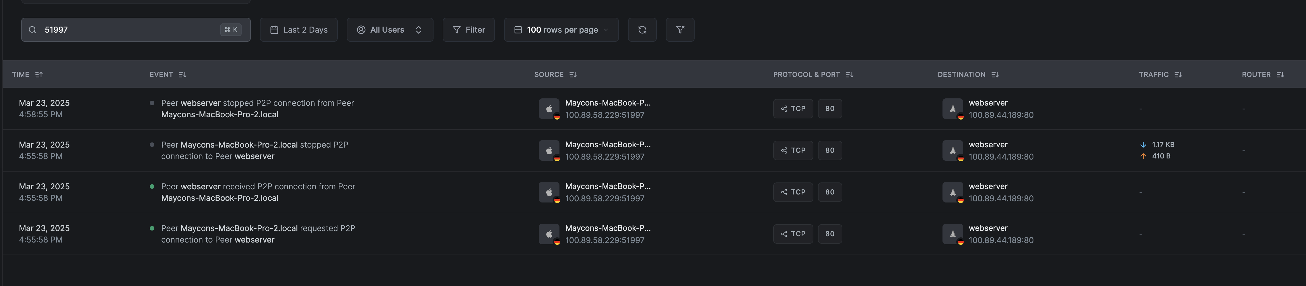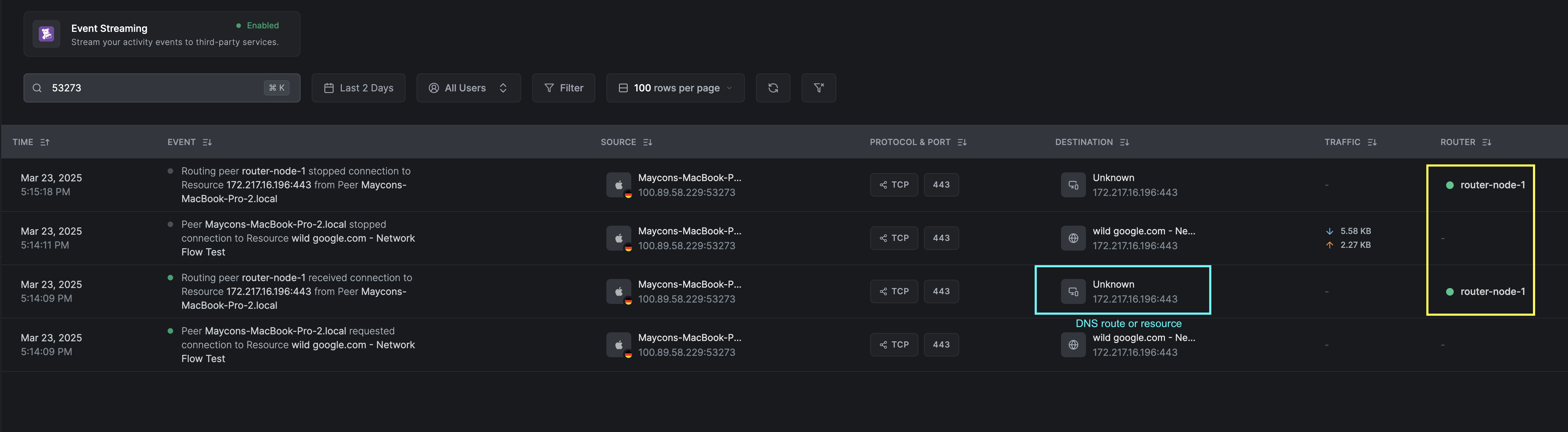 The traffic events logging functionality enables comprehensive monitoring and analysis of connections across your infrastructure. It captures network activity, including peer-to-peer, site-to-site, peer-to-resource, and other network traffic events.
