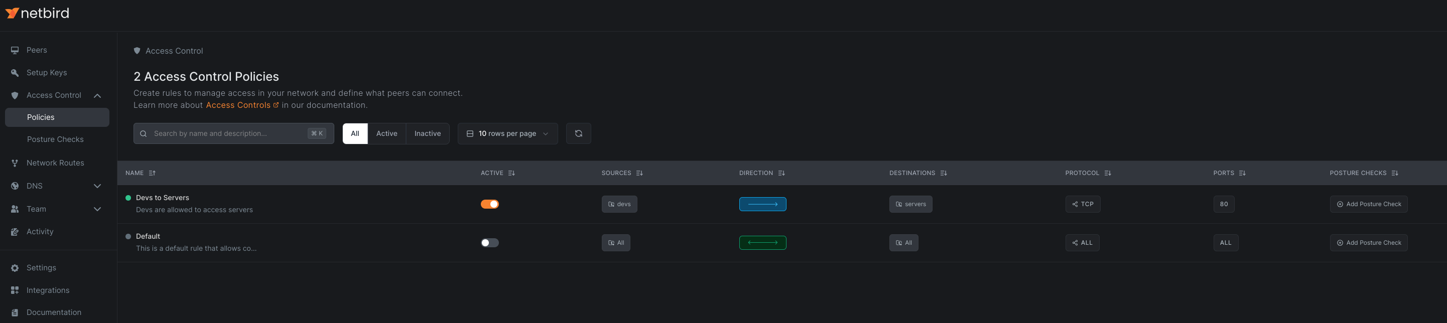 Route access policies are unidirectional and apply only from routing clients to routing peers. The access control group takes effect only when used as a destination group in a policy.