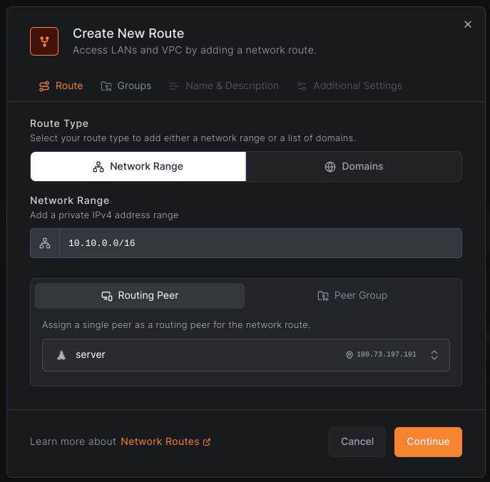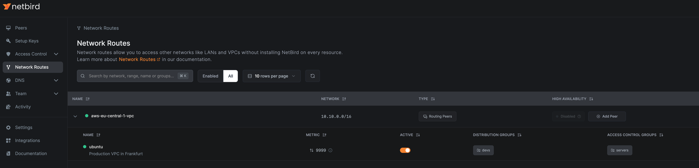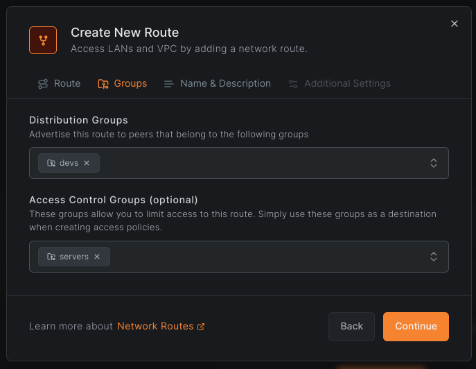 To create a network route with access control groups, navigate to Network Routes and click Add Route.