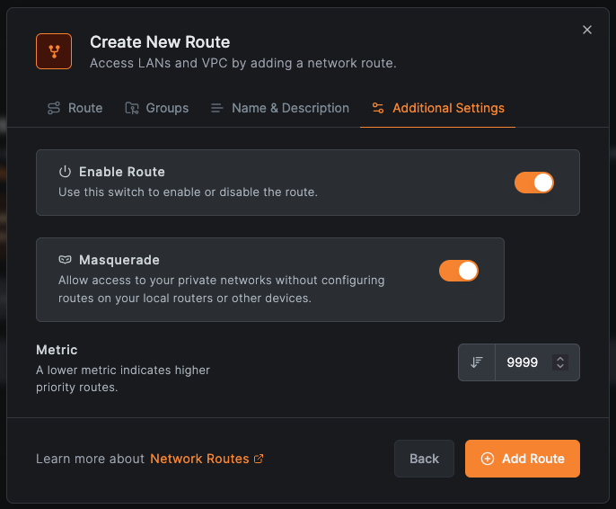 - Access Control Groups: "aws-routing-peers" (required for route-level policies—this group becomes the destination in access policies; without it, policies targeting this route won't apply)