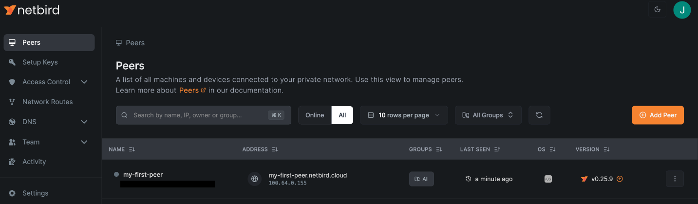 - Sign-in to your openZro deployment at https://your-management.example.com/ and go to the Peers tab.