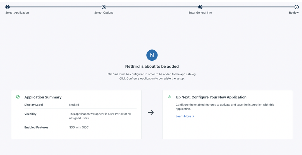 Add openZro as Display Label and click Next. Optionally, you can enter a Description, adjust the User Portal Image and choose to hide or Show in User Portal.