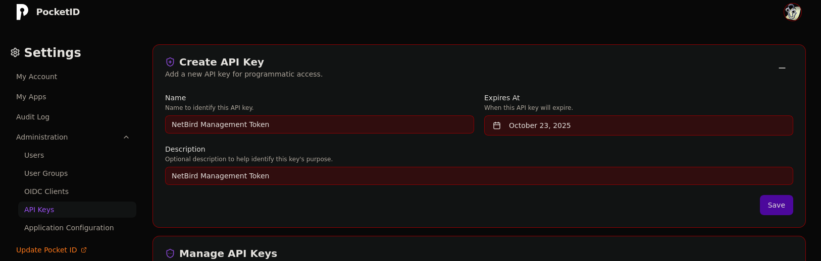 PocketID is secure and effective but makes some tradeoffs in terms of features. Notably, it does not allow scoping the access of API Tokens. Keep careful track of the token used by openZro for management.