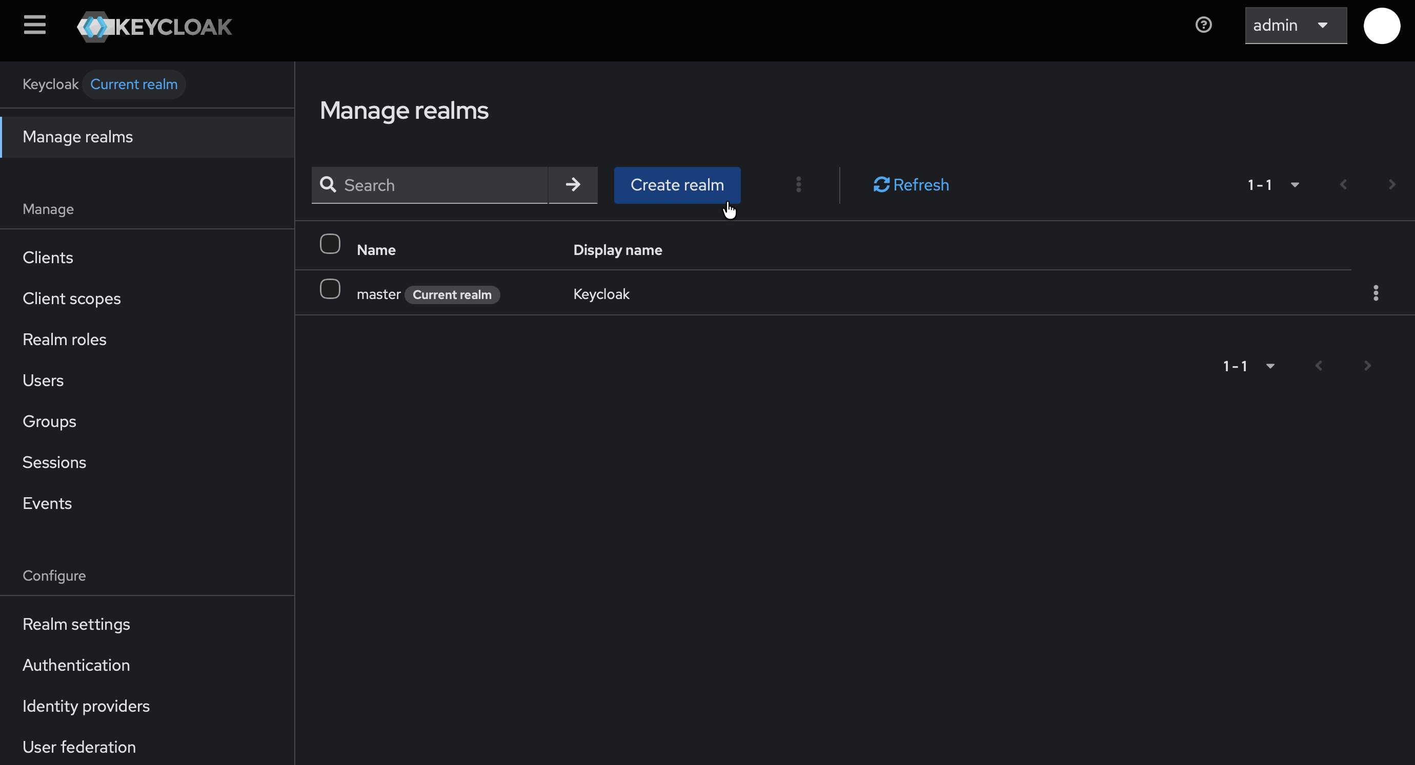 - Hover over the realm dropdown in the top-left corner (where it shows
