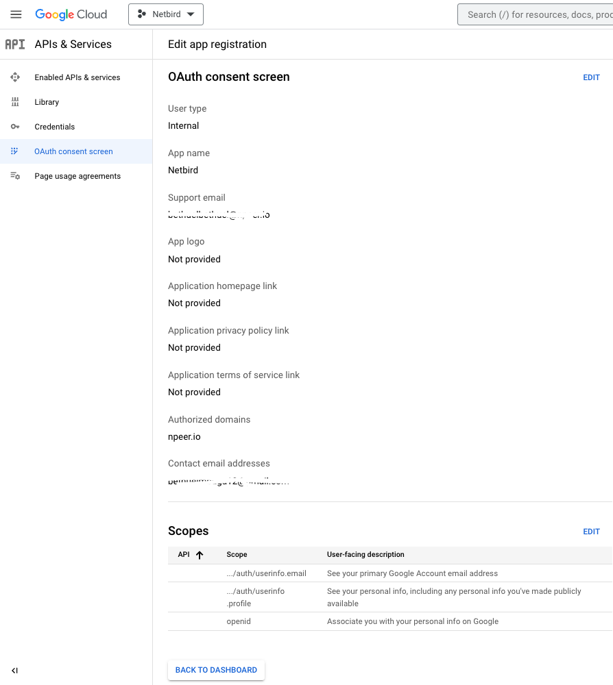 You've configured all required resources in Google Workspace. Continue with the openZro Self-hosting Guide.