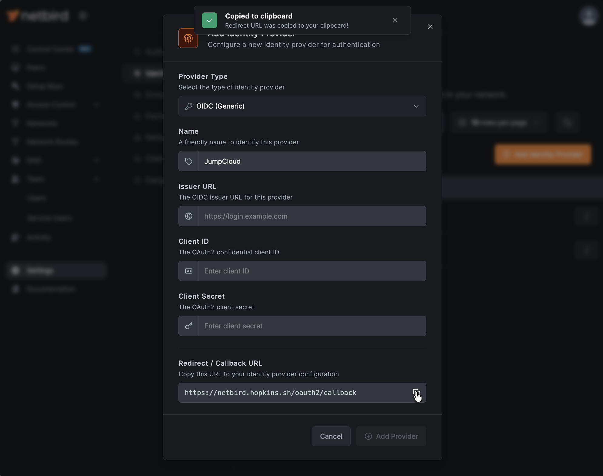 - Copy the Redirect URL that openZro displays (but don't click Add Provider yet)