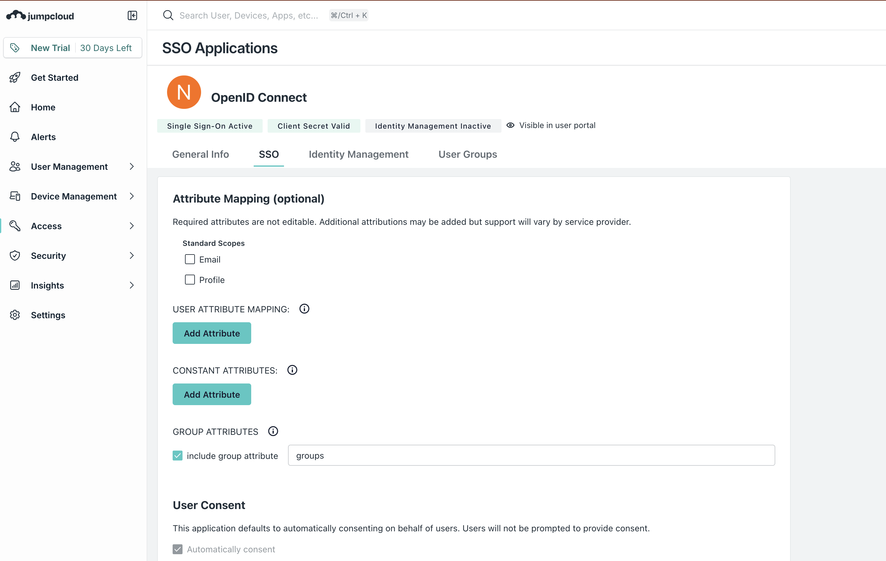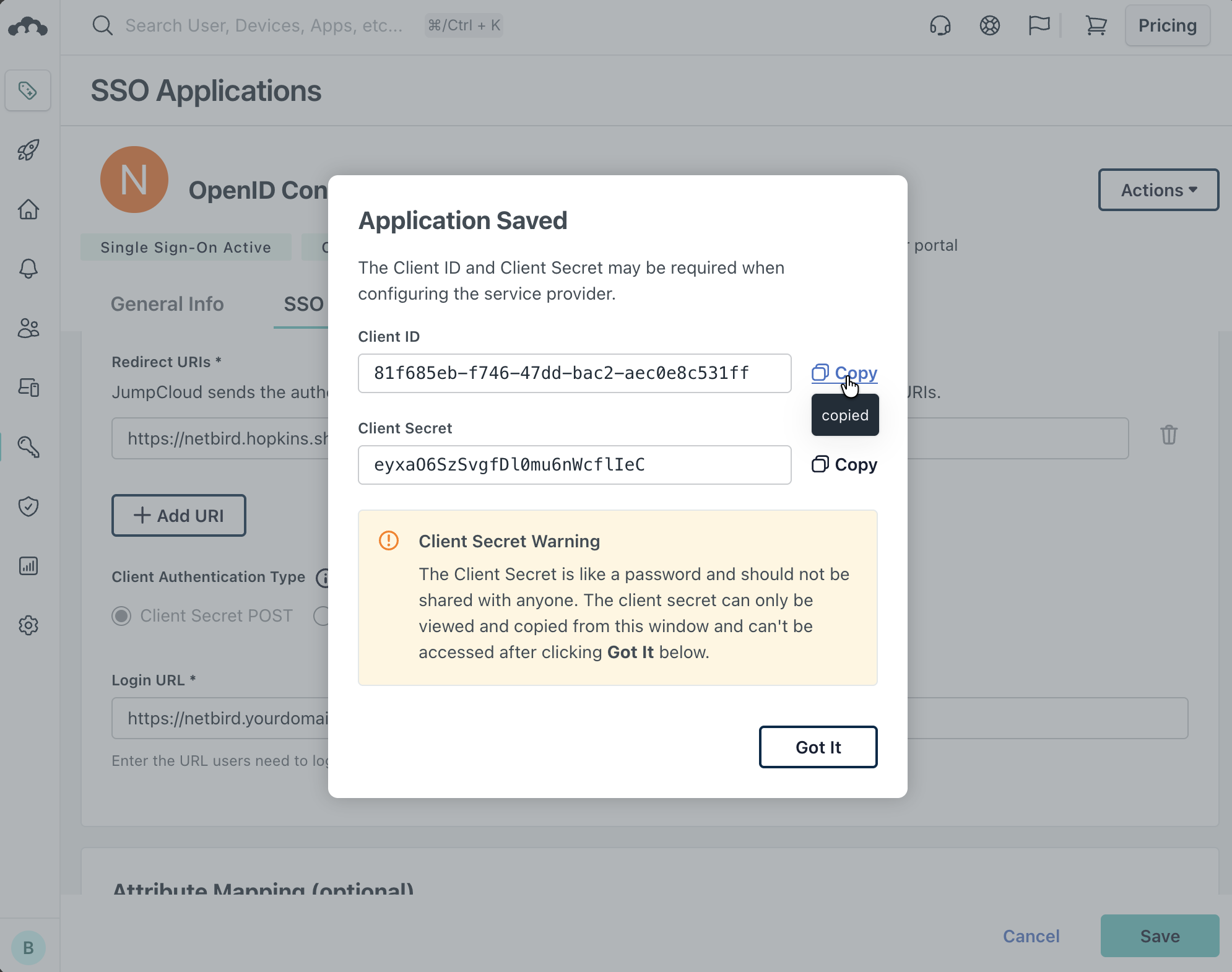 | Client Secret | From JumpCloud application (will fill after Step 3) |