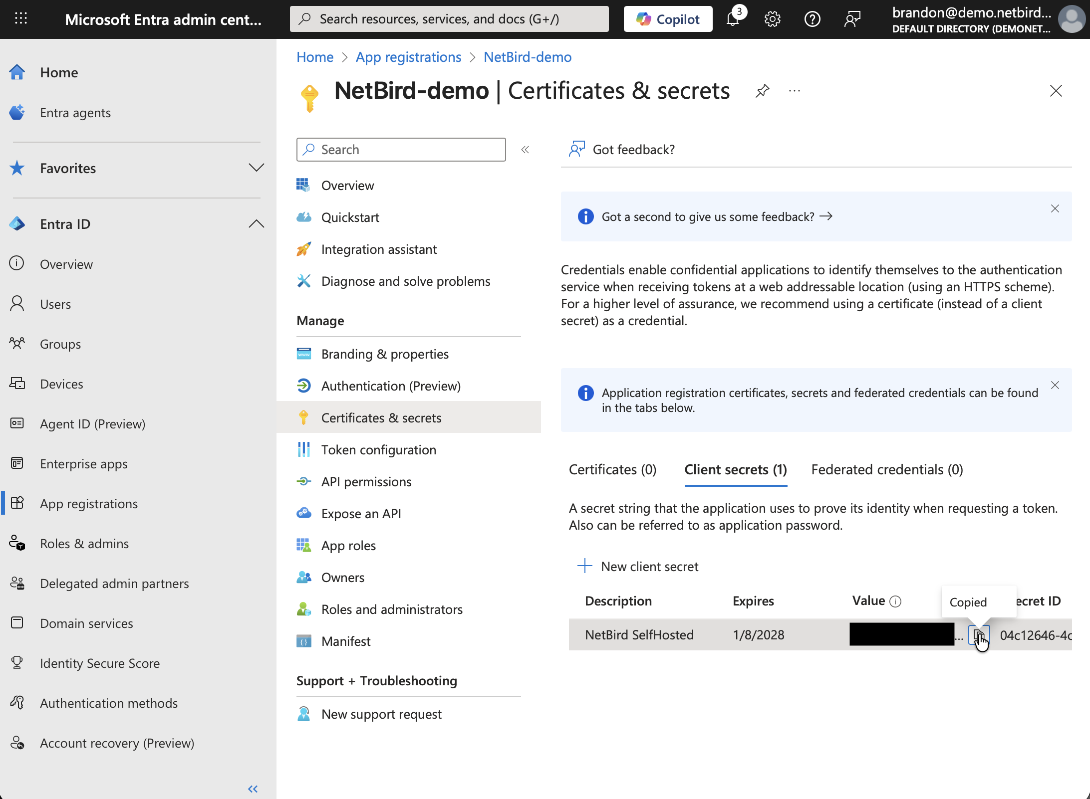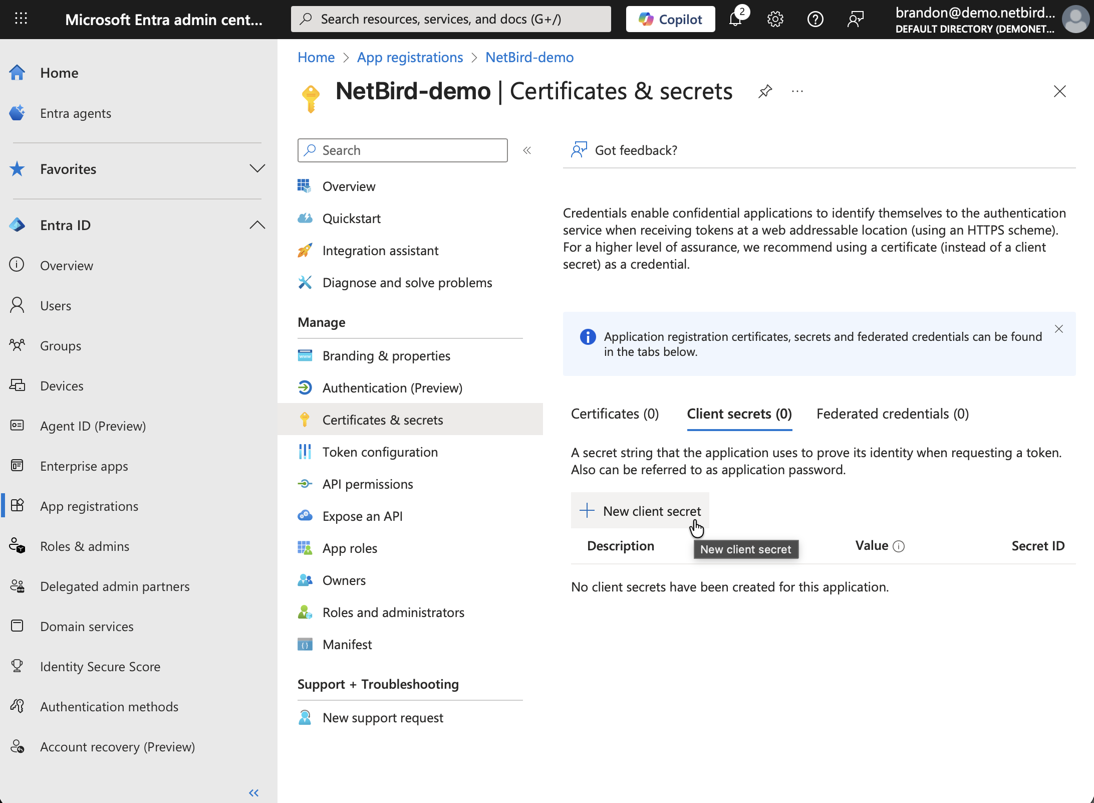 - Go to Certificates & secrets