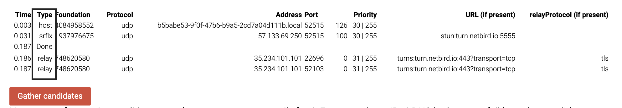 Where you have the following types: host (local address), srflx (STUN reflexive address), relay